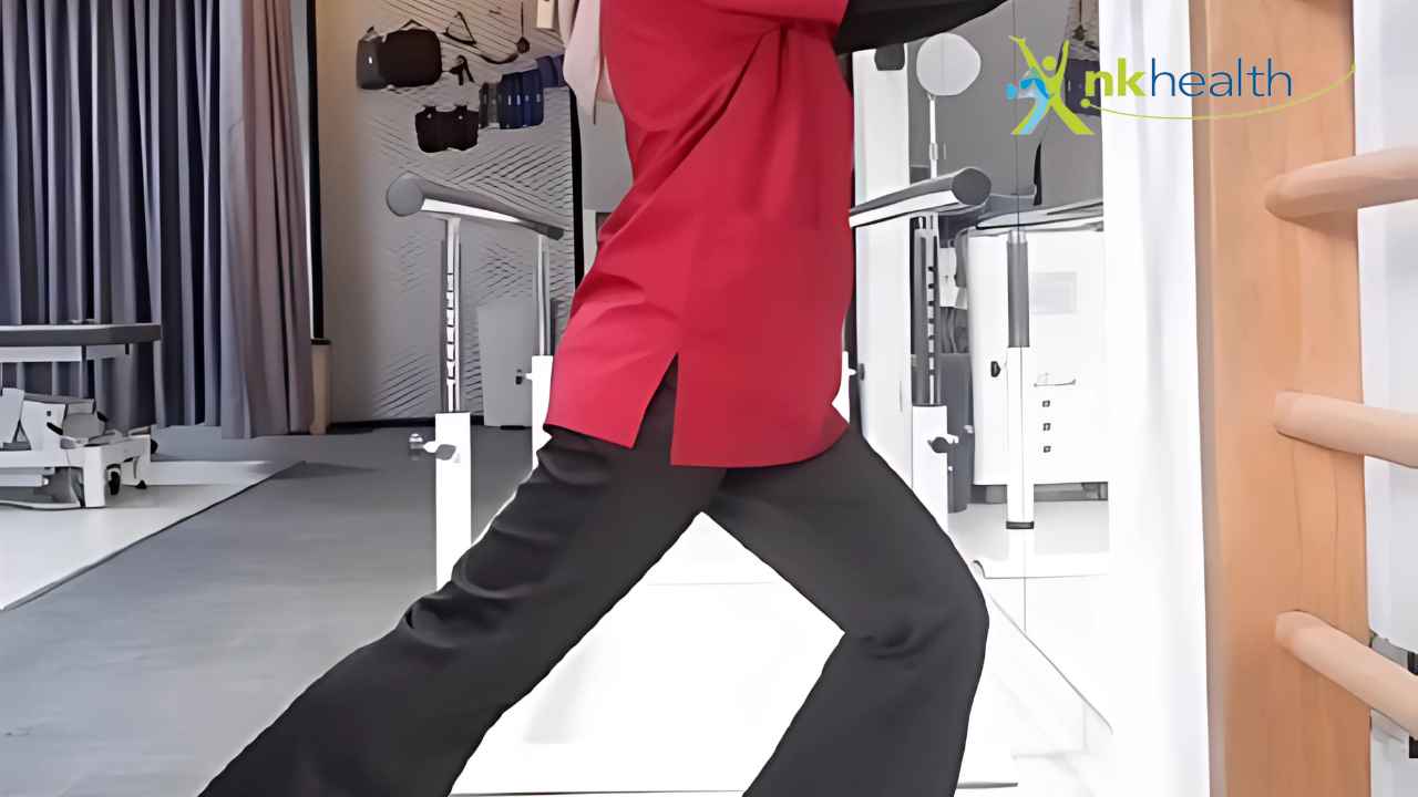 • Langkahkan satu kaki ke belakang dan tekuk lutut depan, sementara lutut belakang tetap lurus dan tumitnya menempel di lantai.