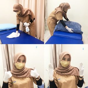 - Untuk kenyamanan dan keamanan pasien sebelum melakukan tindakan fisioterapi, kamu mengutamakan kebersihan tempat dan menggunakan APD lengkap :